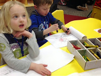 Remember the first day of this week was St. Patrick's Day and sure enough, we had some tricks played on us! Any time we left the room on Monday, when we returned, the room had been ruined! Tables were overturned, toys were everywhere and even green streamers were strung about! The biggest surprise was when we found proof the leprechaun even had used our bathroom! Gross! What a silly day!