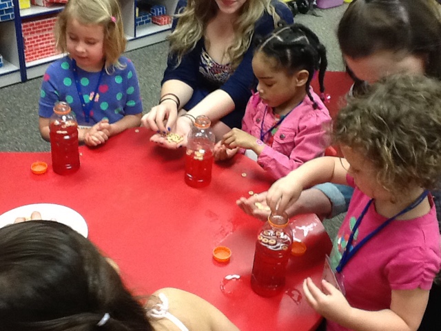 As it begins to warm up outside, the teachers love to bring the preschoolers outside for some fresh air. We demonstrated a science experiment outside about how our bodies process our food. The children took turns mashing up some crackers in a bag and then the teacher poured in some sprite to act as the acid that churns our food. The children watched and listened as the bubbles broke down the crackers like our stomachs break down our food after we eat.